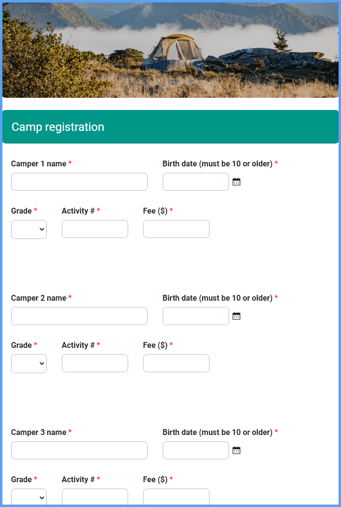 Get started with online registration for your recreation program events today! This activity registration form template is perfect for student activities or your local parks and recreation program. Streamline the online registration process for both the parks and recreation department and community participants with this simple application form.